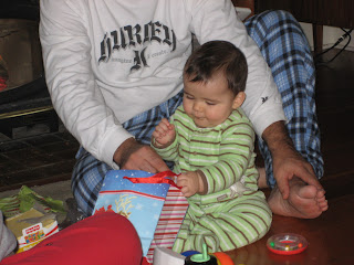 Dashiell's First Christmas was fun, although relatively easy since he isn't yet into Santa or presents. Kevin and I wrapped a couple of small gifts for him, and his Aunt got him a few things to open (they were more things for us....thank you!). Dash was more interested in putting his mouth on everything, including the wrapping paper, gifts bags, and gifts....and my feet! He did seem to enjoy the classic ring stacker toy. He isn't quite grasping the stacking concept, but did like putting all of the different rings in his mouth, as well as tossing then on the floor.